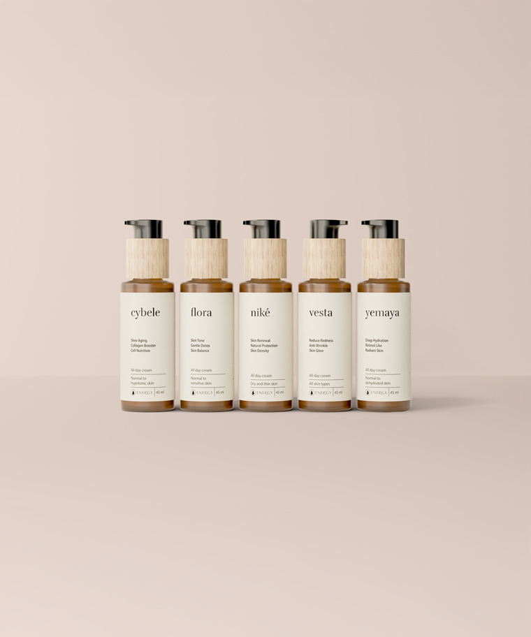 Vlajková loď v podobě pěti krémů cybele, flora, niké, vesta a yemaya. Pět bohyň představujících jedinečný prvek přírody, jedinečný element a jedinečný krok ke skutečně hluboké, trvalé a udržitelné kráse.